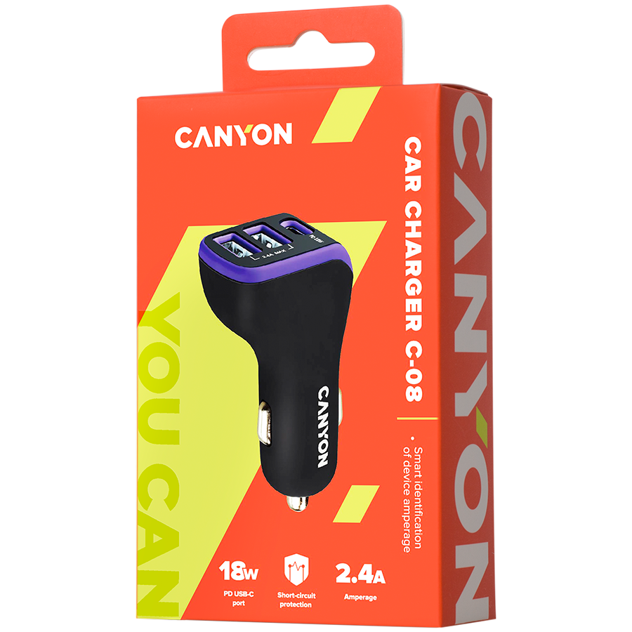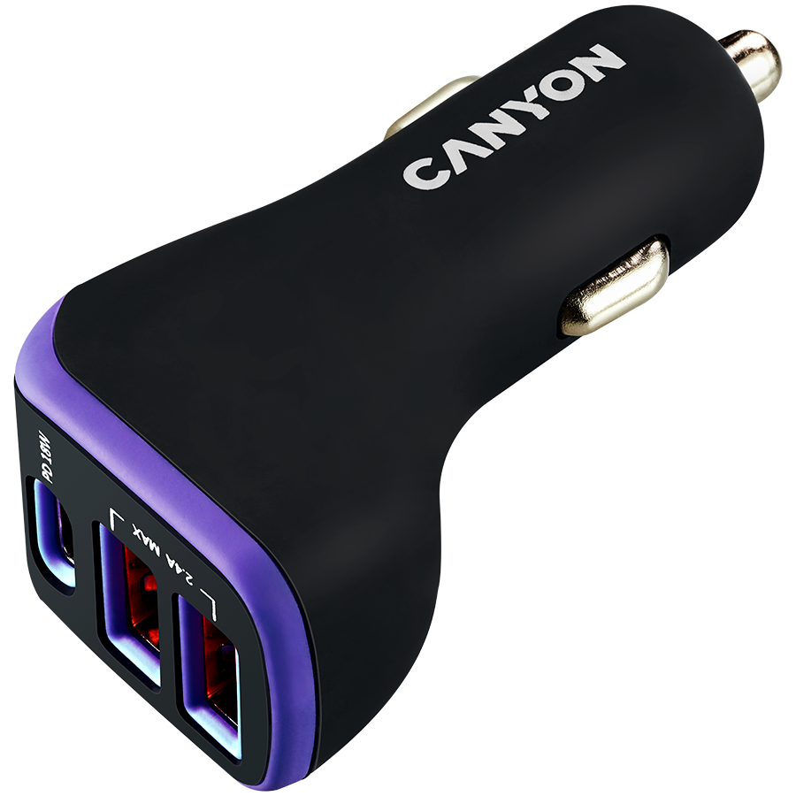 Commercial Name CANYON car charger C-08 PD 18W USB-C 2USB-A Black Purple