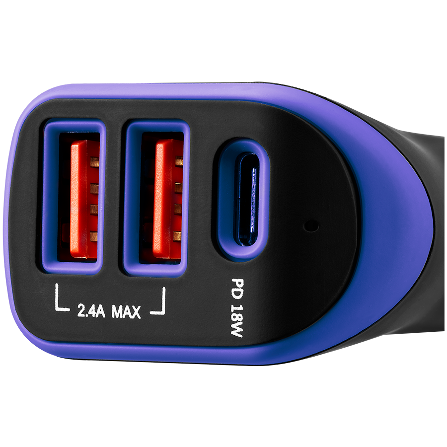CANYON C-08, Universal 3xUSB car adapter, Input 12V-24V, Output DC USB-A 5V/2.4A(Max) + Type-C PD 18W, with Smart IC, Black+Purple with rubber coating, 71*39*26.2mm, 0.028kg