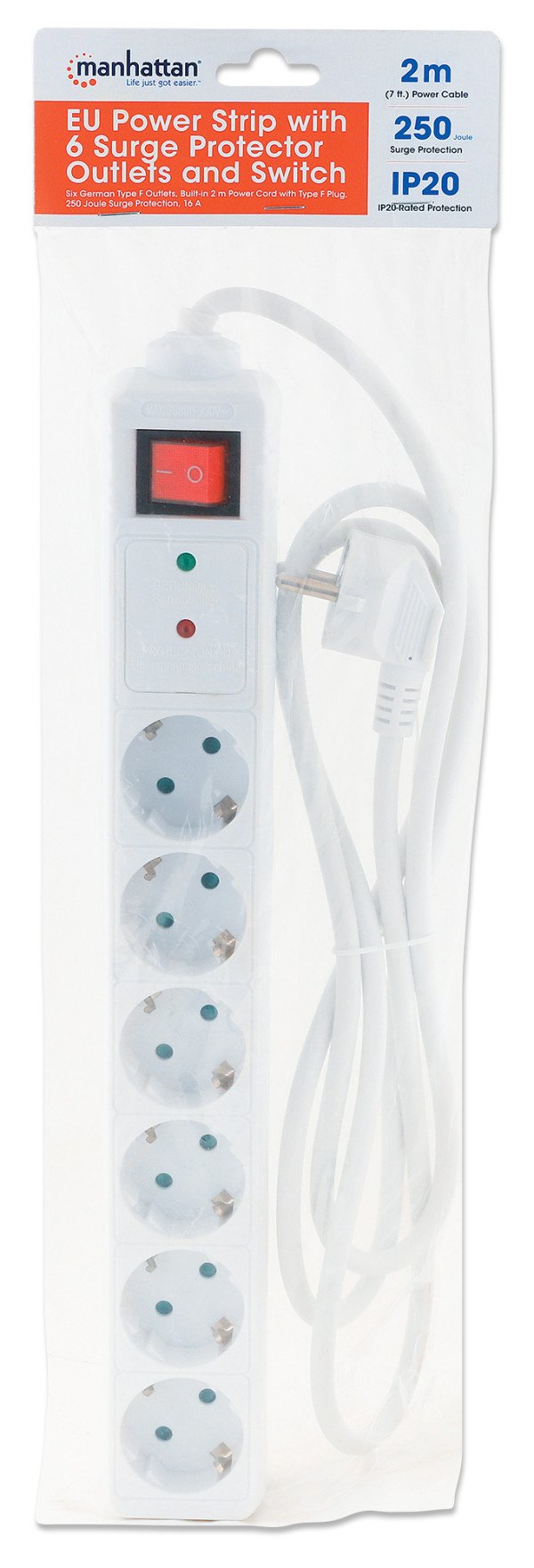 Uključite svoj štampač, računar, ruter, TV ili drugu kućnu/kancelarijsku elektroniku u ovaj provodnik sa 6 utičnica sa Menhetna. Kompatibilan je sa standardnom električnom opremom i ima šest nemačkih utičnica tipa F u izdržljivom belom plastičnom kućištu za čist izgled. Za maksimalnu sigurnost, ima stepen suzbijanja prenapona od 250 džula za odbranu vaših osetljivih elektronskih komponenti od strujnih udara i skokova. Osvetljeni prekidač za uključivanje/isključivanje omogućava kontrolu jednim dodirom nad svim povezanim uređajima.
