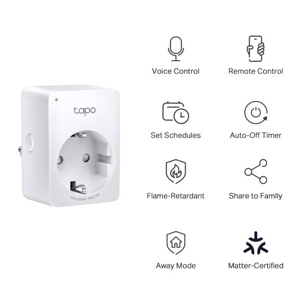 Karakteristike *Napravljeno od V-0 (UL94) materijala otpornih na plamen. Lako podešavanje i korišćenje – Koristite Bluetooth da biste lako uključili pametni priključak u nekoliko koraka. Uz Matter podršku, Tapo P100M omogućava korisnicima da skeniraju uključeni Matter kod za podešavanje bez frustracija.